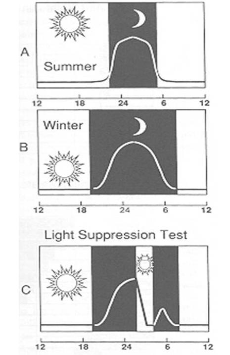 Figure 2. Exposure of light during the night, decreases melatonin production. From: Sack, R. L., Blood, M. L., Hughes, R. J., Lewy, A. J. (1998). Circadian-Rhythm Sleep Disorders in Persons Who Are Totally Blind. Journal of Visual Impairment & Blindness, 92, (3).