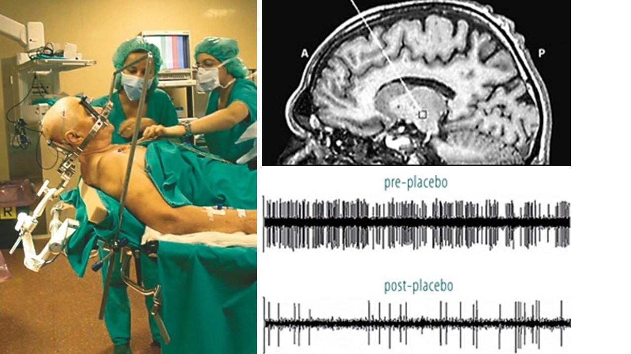 Figure 1. Recording the activity of single neurons from the brain of an awake patient suffering from Parkinson’s disease. Both the recording apparatus (a) and the electrode track (b) can be seen. In (c), the activity of a single neuron in the subthalamic nucleus can be seen before and after placebo administration (reproduced from: Benedeteti, F.(2007). The Placebo and Nocebo Effect: How the Therapist’s Words Act on the Patient’s Brain. Karger Gazette, 69).