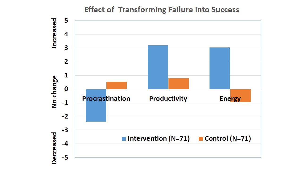 For many years, we have taught students a useful daily practice,Transforming Failure into Success, to transform the self-blame into optimizing performance. When the students as well as athletes practices this for a week, they report significant improvement in study habits, dealing with anger, and even sports performance. This year we systematically measured the effect of this practice and compared it to a control group. The students, just as previous athletes and clients, reported a significant decrease in procrastination and increase in productivity and energy as compared to the control group as shown in figure 1.