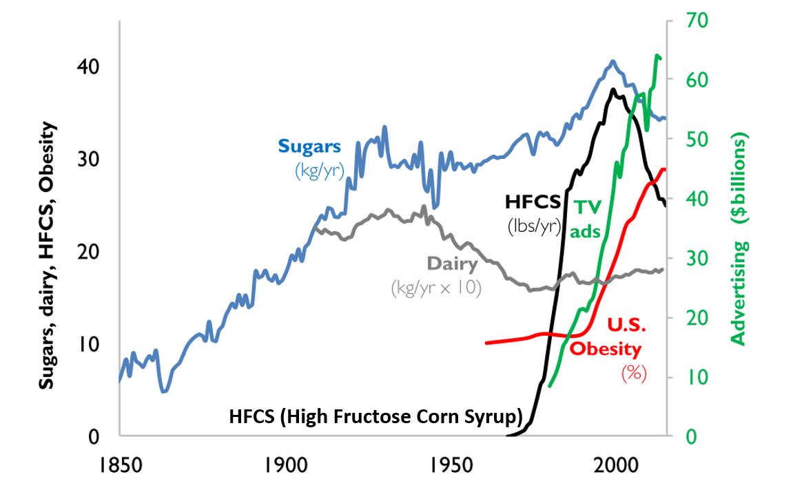 Figure 2. A timeline from 1850 to 2000 reflects the increase in use of refined sugar and high fructose corn syrup (HFCS) to the U.S. diet, together with the increase in U.S. obesity rate. The data for sugar, dairy and HFCS consumption per capita are from USDA Economic Research Service (Johnson et al., 2009) and reflects historical estimates before 1967 (Guyenet et al., 2017). The obesity data (% of U.S. adult population) are from the Robert Wood Johnson Foundation’s Trust for America’s Health. (stateofobesity.org). Total U.S. television advertising data are from the World Advertising Research Center (www.warc.com). The vertical measure (y–axis) for kilograms per year (kg/yr) on the left covers all data except advertising expenditures, which uses the vertical measure for advertising on the right. Reproduced by permission from Bentley et al, 2018.