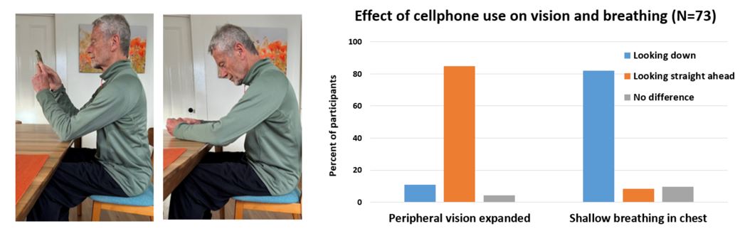 Peper, E. (2024b). Changes in vision and breathing when looking down or straight ahead at the cellphone. Data collected from HH380 class, Spring, 2024, San Francisco State University. Unpublished.