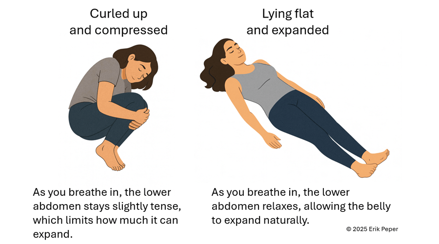 Figure 2. Curling up compresses the abdomen and prevents relaxation of the lower belly. In contrast, lying flat with the body gently expanded allows the abdomen to move freely with each breath, which can help reduce menstrual discomfort.