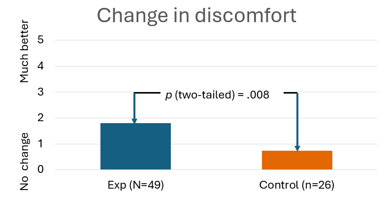 Seventy-five university women participated across two upper-division Holistic Health courses. Forty-nine practiced 30 minutes per day of breathing and relaxation over five weeks as well as practicing the moment they anticipated or felt discomfort; twenty-six served as a comparison group without a specific daily self-care routine. Students rated change in menstrual symptoms on a scale from –5 (“much worse”) to +5 (“much better”). For the detailed steps in training, see the blog: https://peperperspective.com/2023/04/22/hope-for-menstrual-cramps-dysmenorrhea-with-breathing/ (Peper et al., 2023).