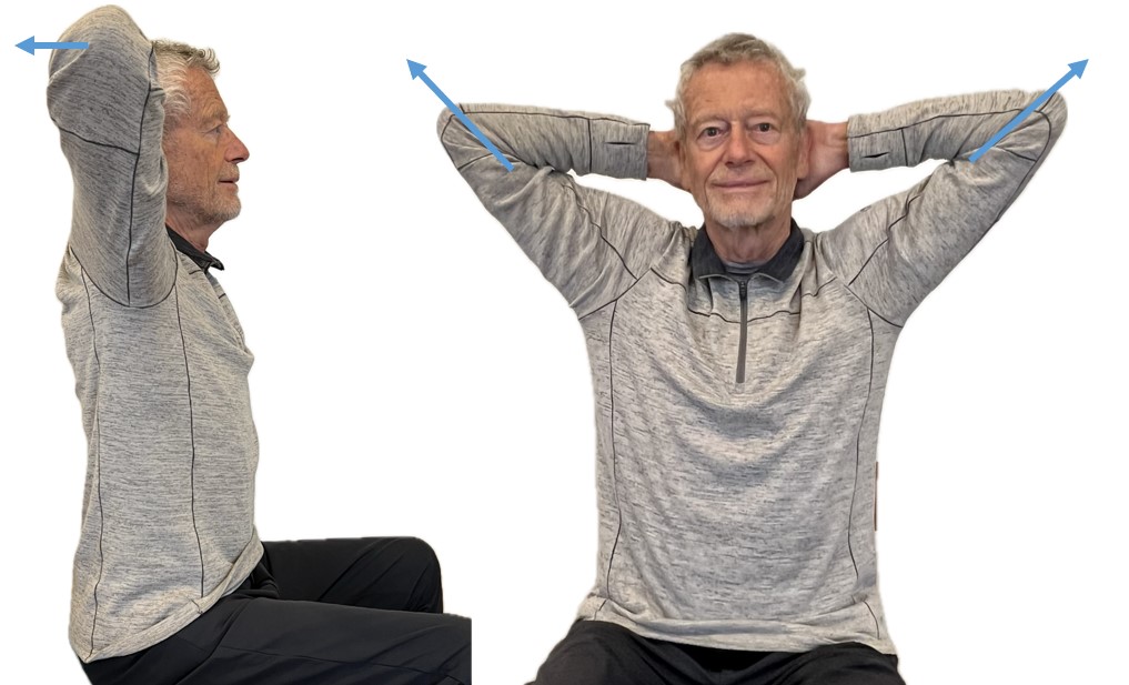 - Integrated body movement with breathing especially flexion and contraction (Meehan & Shaffer, 2023). Integrate the normal response of flexion that induces exhalation and extension evokes inhalation. Be careful that the flexion movement does not encourage participants to compress their chest during exhalation, which tends to encourage chest breathing. Have the person focus on their head staying tall and erect. Have the person sit straight up with their feet slight apart and their hands palm down on their lap. Allow inhaling to initiate as the person simultaneously arches their lower back expanding the stomach, separating the knees and turning the hands palm up. Initiate exhalation while simultaneously bringing the knees together, turning the palms face down on the thighs and rolling the pelvic back slightly rounding the lower back. Do the movements smoothly while keeping the legs and shoulders relaxed.