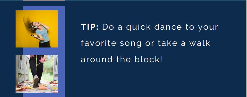 - Get up and do a few movements such as shoulder rolls, skipping, or arm swings.