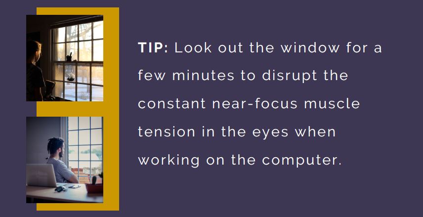 Eyestrain tends to develop when we do not relax the eyes by periodically looking away from the screen. When we look at the horizon or trees in the far distance the ciliary muscles and the extraocular muscles relax (Schneider, 2016).