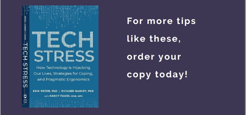 Peper, E., Harvey, R., & Faass, N. (2020), TechStress-How Technology is Hijacking our Lives, Strategies for Coping and Pragmatic Ergonomics. Berkeley, CA: North Atlantic Books.